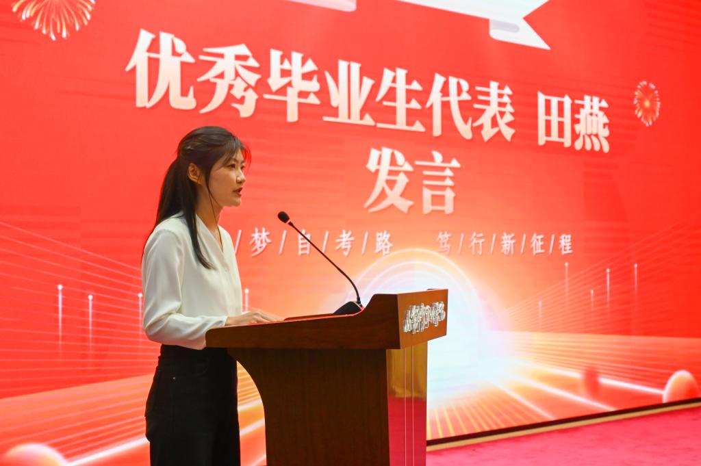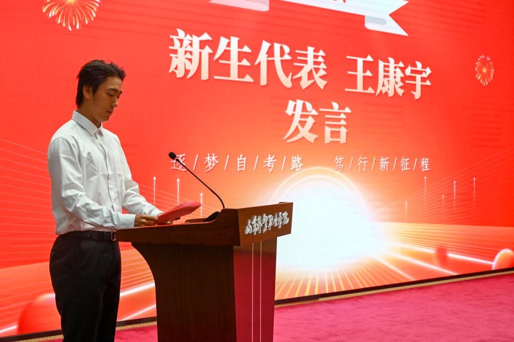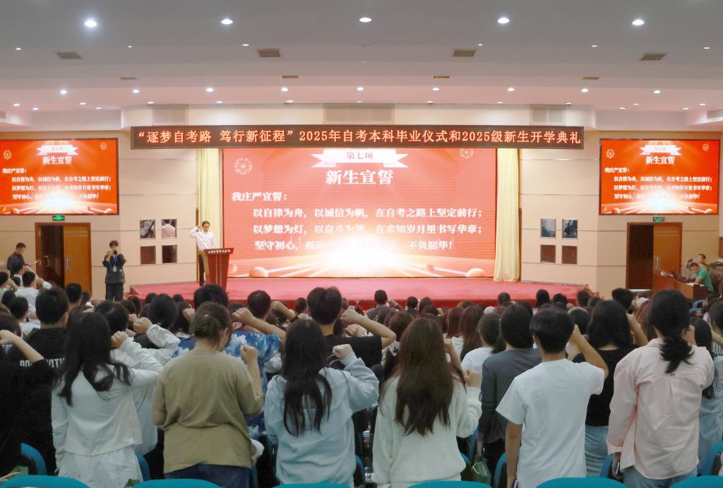 教师代表孙菲菲,优秀毕业生代表田燕,新生代表、2025级国际经济与贸易专业学生王康宇分别发言。发言结束,王康宇带领全体新生宣誓,以铿锵誓言表达全体自考学生“以自律为舟,以诚信为帆,坚守初心,不负韶华”的坚定信念。