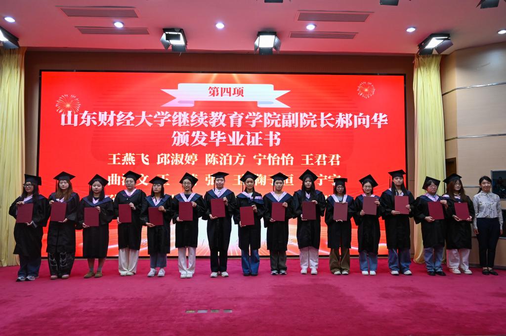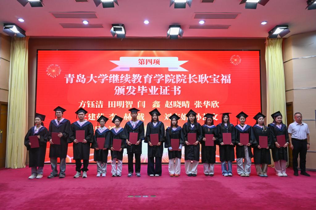 青岛大学继续教育学院耿宝福院长、山东财经大学继续教育学院郝向华副院长代表主考院校为45名毕业生代表拨穗正冠、颁发毕业证书。
